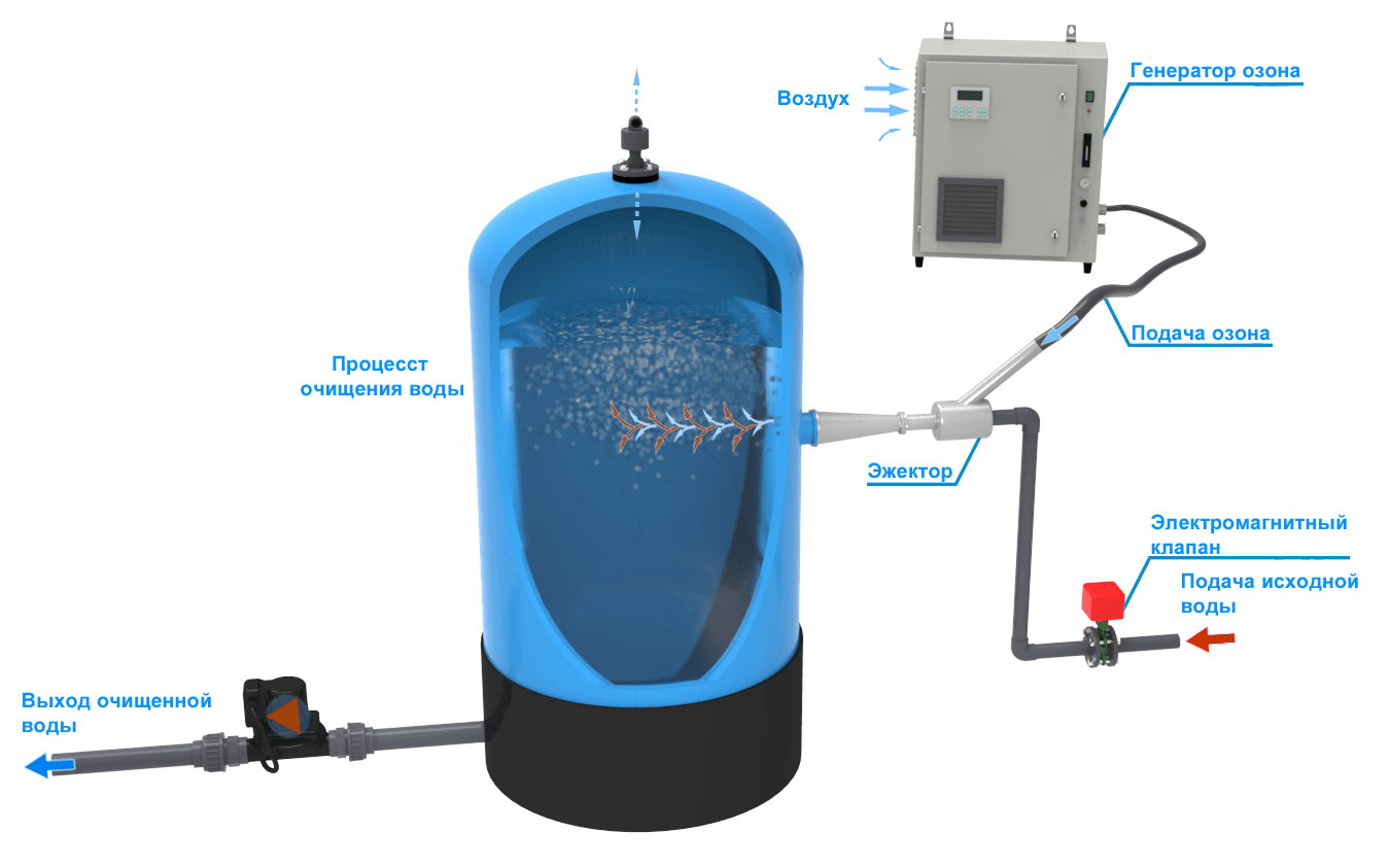 Озон активно применяется для очистки воды в бассейнах, системах водоснабжения, пищевой промышленности. Он уничтожает микроорганизмы, удаляет железо, марганец и химические примеси