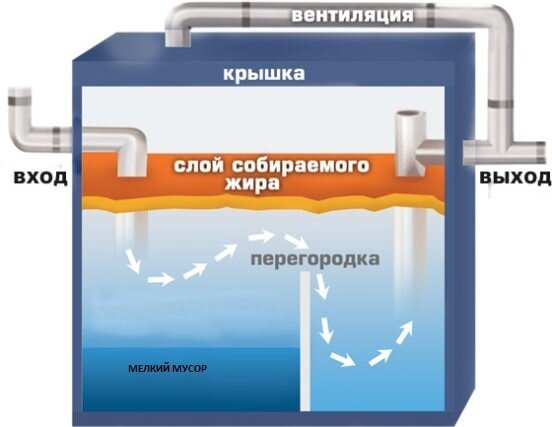 Внутри масложироуловителя вода замедляется — это важно, так как процесс разделения компонентов основан на различной плотности веществ. Жиры и масла легче воды, поэтому они начинают всплывать, а более тяжёлые частицы (например, остатки пищи) — оседать на дно