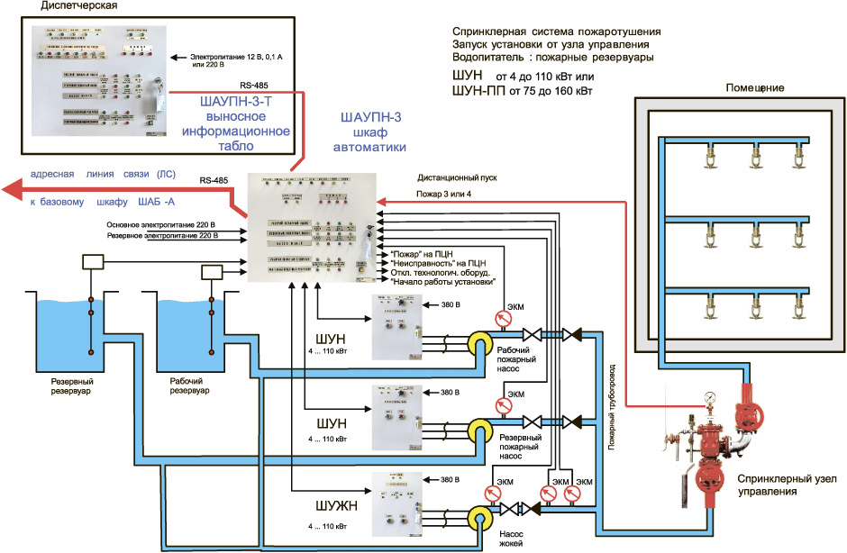 Щит управления подает напряжение на пускатели основных пожарных насосов, которые запускаются (обычно с небольшой задержкой друг относительно друга для снижения пусковых токов). Они начинают подавать воду в сеть пожаротушения под высоким давлением