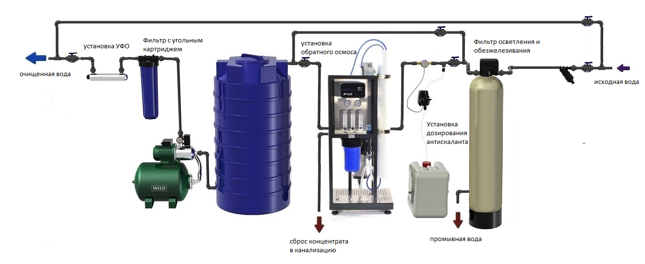 Очищенная вода выходит через выходной патрубок и направляется в систему водоснабжения