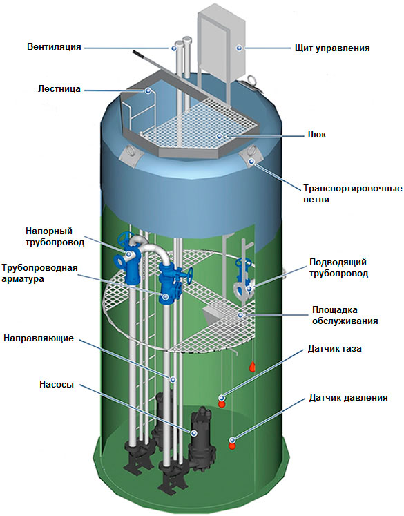 Насосы перекачивают стоки из накопительного резервуара в напорный трубопровод