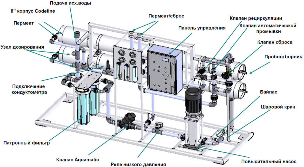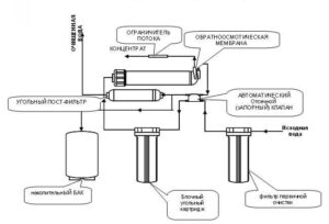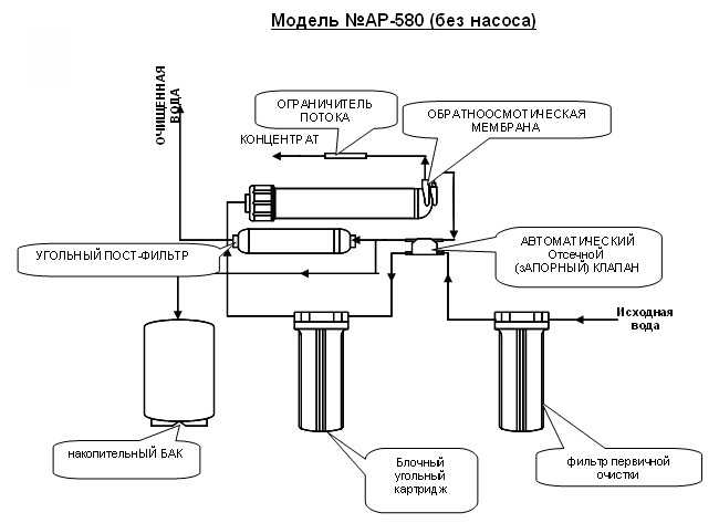 Дополнительная очистка (опционально) — перед подачей воды пользователю может быть установлен постфильтр (например, угольный), улучшающий вкус и запах воды