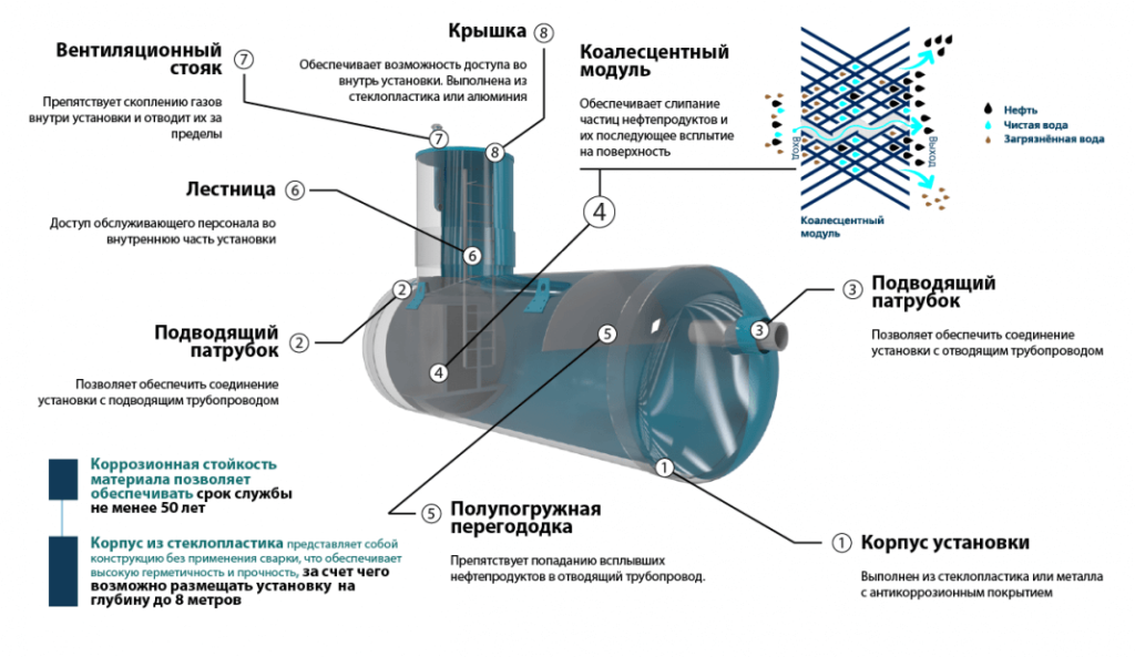 Стоки поступают в приёмную камеру, где замедляется их поток. За счёт разности плотностей воды и масел происходит естественное разделение: жиры и масла всплывают вверх, а очищенная жидкость перемещается в следующую камеру. Там коалесцентные элементы способствуют укрупнению капель масел, ускоряя их всплытие. После этого вода проходит в отводную камеру и направляется в систему канализации, а загрязнения удаляются с поверхности вручную или автоматически