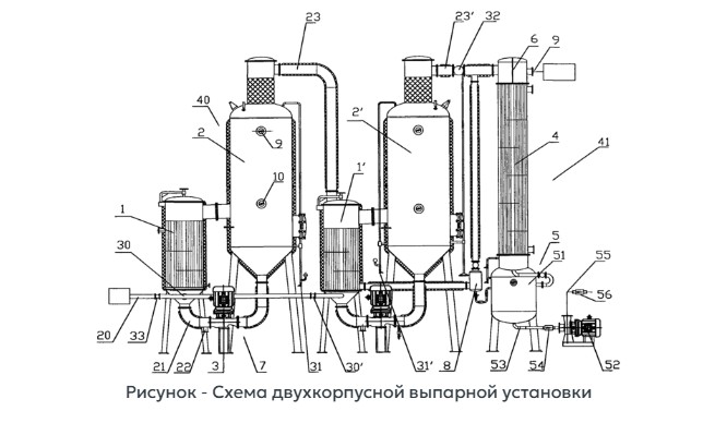 это система, состоящая из двух последовательно соединённых аппаратов, в которых происходит частичное удаление влаги из исходного раствора путём его выпаривания. Установка работает в режиме повторного использования вторичного пара, что существенно снижает затраты на энергоресурсы