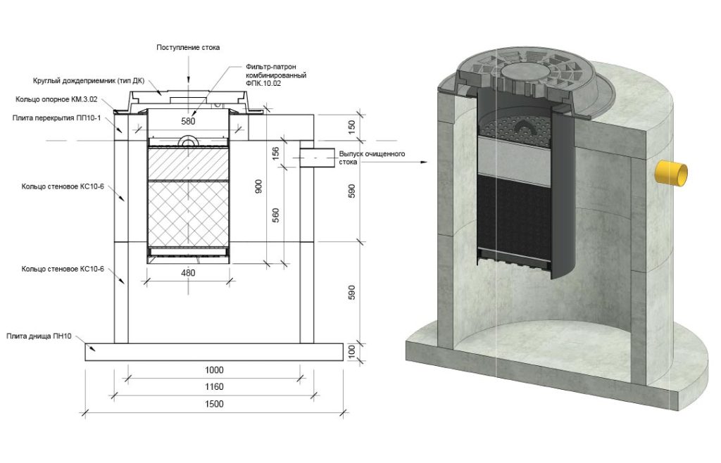 Установка фильтрующего патрона производится на опорное стальное кольцо, которое монтируется между железобетонными кольцами колодца. Это кольцо служит основанием для размещения патрона и одновременно предотвращает проникновение загрязненной воды в область, предназначенную для очищенного стока.