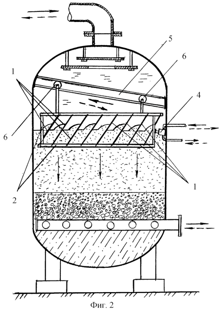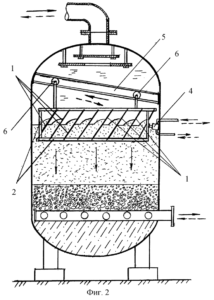 Загрязнённая вода поступает во входной патрубок в верхней части и равномерно распределяется по загрузке