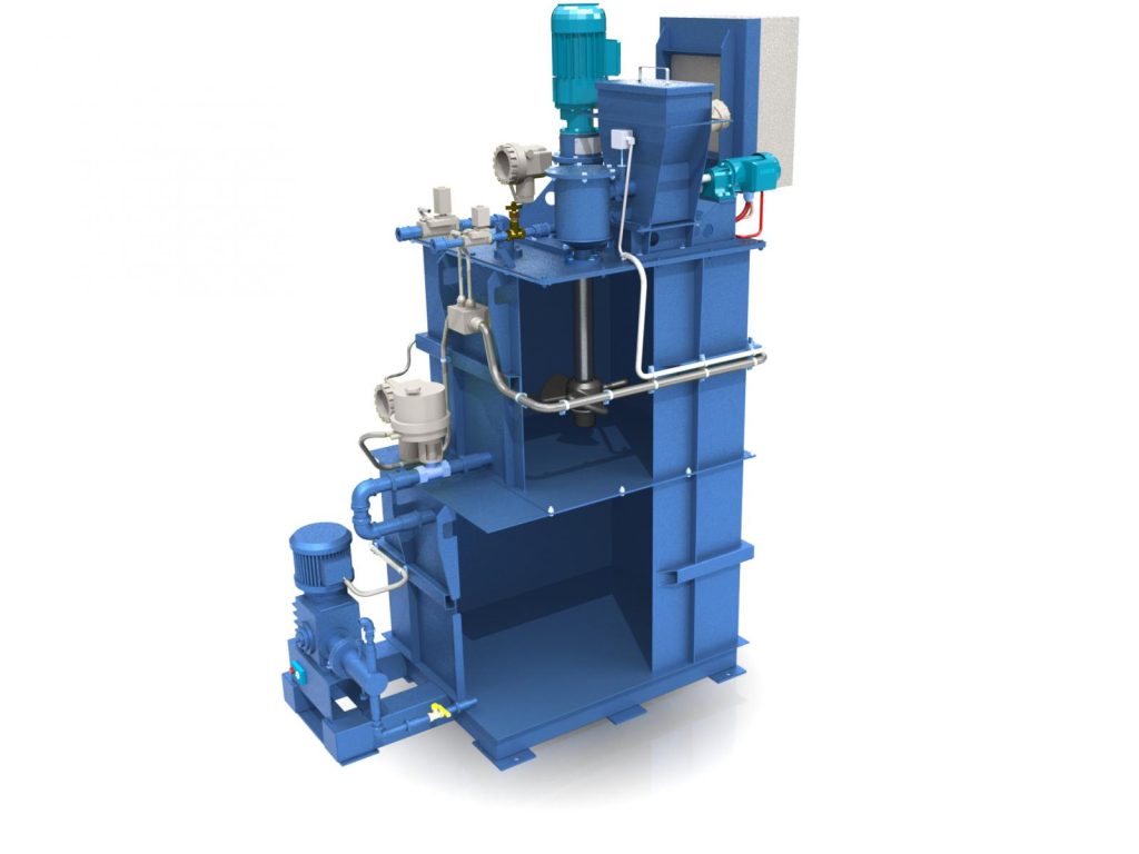 Станции для приготовления раствора из сухого флокулянта — оснащены загрузочным бункером, шнековым дозатором и системой увлажнения. Используются при необходимости точного дозирования флокулянта в высокой концентрации