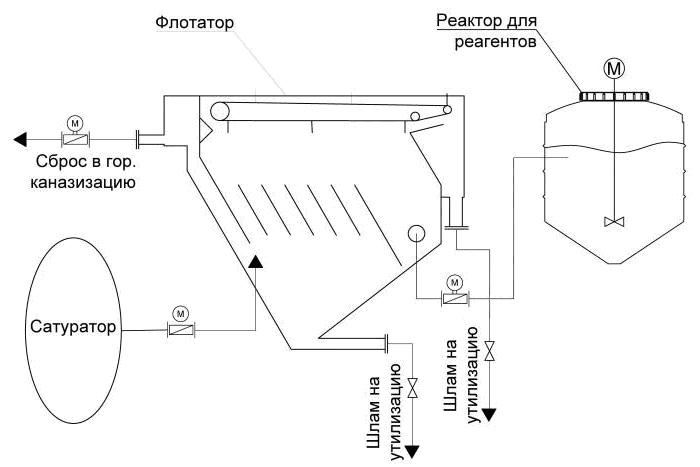 Технологическая схема, в которой флотатор выступает основным элементом обработки, обязательно включает блок подготовки реагентов и оборудование для генерации пузырьков воздуха. Блок реагентной обработки состоит из резервуаров с коагулянтами, флокулянтами и щёлочью (для корректировки pH), а также реакционной камеры, где происходит смешивание воды с реагентами.