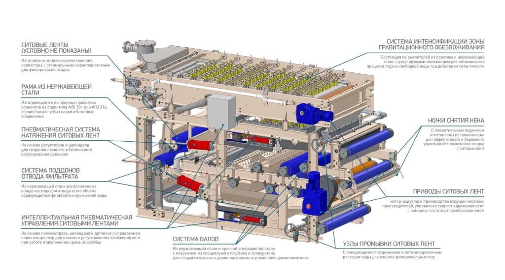 Конструкция ленточного фильтр-пресса включает: