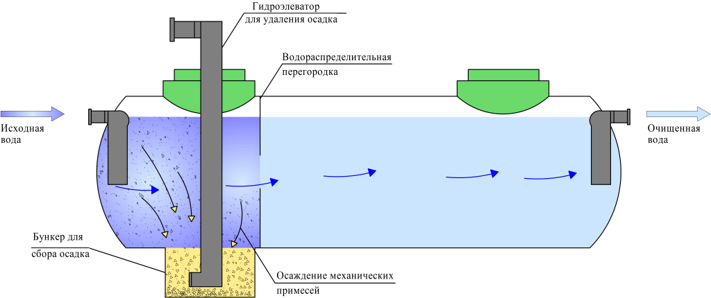 это резервуар, где вода движется с небольшой скоростью, а тяжёлые загрязнения оседают на дно под действием силы тяжести. Он является основой механической очистки в современных очистных сооружениях, работая до этапа биологической обработки