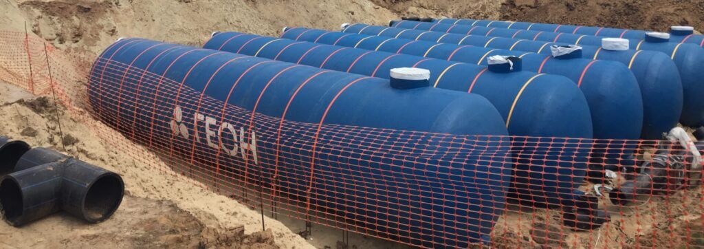Подземные (дренажные) резервуары представляют собой герметичные и прочные цилиндрические емкости горизонтального типа, установленные на опорах и оснащённые сервисными колодцами. Конструкция предназначена для монтажа в грунт любого типа на глубину до 6 метров