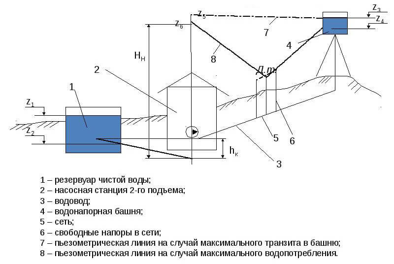 Расчет напора зависит от требующегося свободного напора и рельефа окружающей местности. Кроме того, определяясь с типами насосов и их количеством, нужно учитывать, что они функционируют совместно с водоводами либо водопроводной сетью