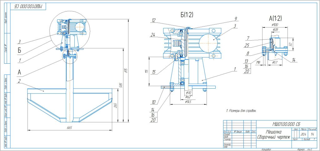При проектировании мешалки ключевую роль играет сборочный чертеж, который содержит: