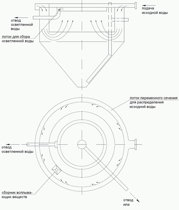 Осветлённая вода, достигнув верха, попадает в кольцевой переливной лоток, расположенный по периметру корпуса. Оттуда она направляется на следующий этап очистки или отводится из системы