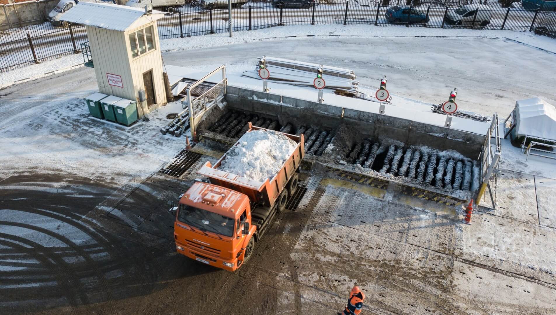 Сюда доставляется снег с городских улиц снегоуборочной техникой. Бункер оснащён усиленными стенками для выдерживания больших объёмов снега