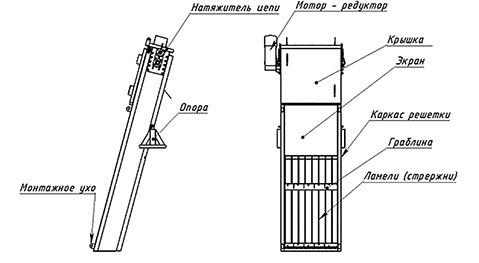 Особенность конструкции установки для механической очистки сточных вод заключается в использовании крюков, выполненных из износостойкой пластмассы. Эти крюки собраны в единое полотно, которое и выполняет функцию решётки. Расстояние между крюками (прозоры) составляет 5 мм. Все элементы цепного механизма и оси полотна изготовлены из нержавеющей стали марки 95×18